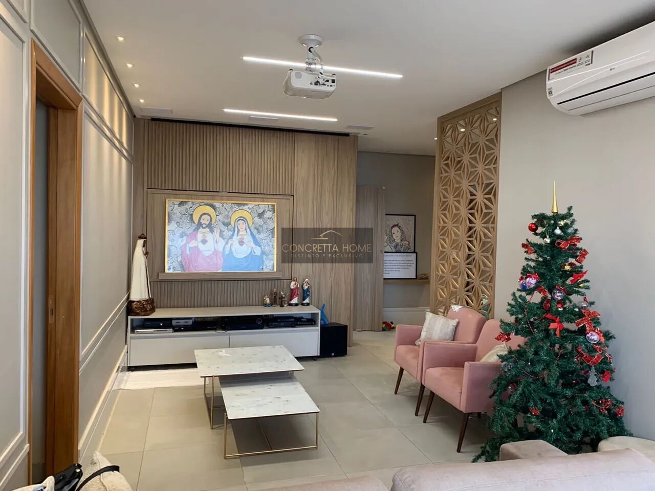 1 Sala de estar integrada à sacada gourmet com telão automático e projetor Móvel planejado com TV giratória Sistema Home Theater no teto Ambiente multiuso 4x1 (brinquedoteca, escritório, sala de tv e dormitório)