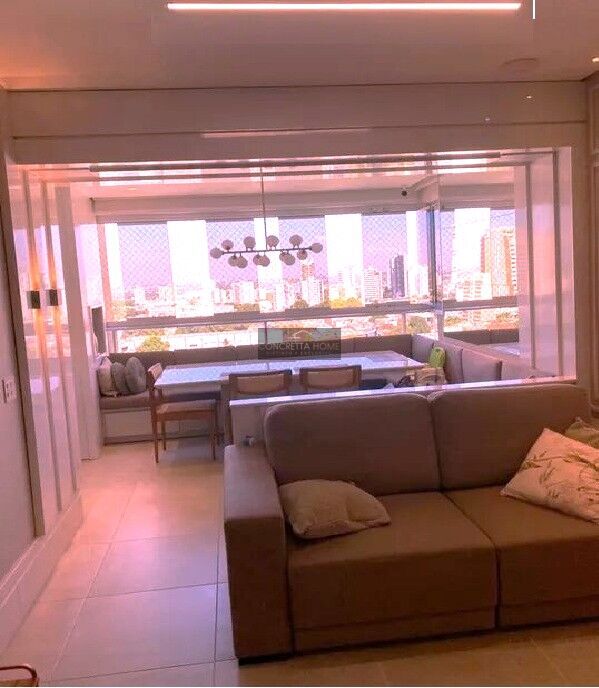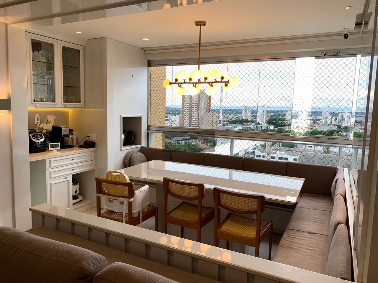 1 Sacada com móveis planejados e canto alemão, com cortina de vidro e persianas solares automáticas Piso porcelanato Portobello em todo apto Piso vinílico no lavabo Rodapés pedra mármore Itália (área social).