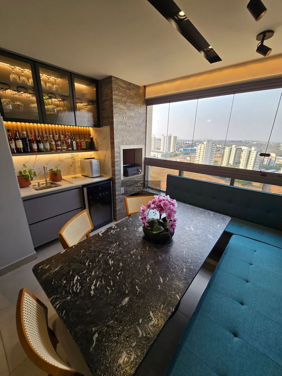 - Varanda Gourmet: 100% integrada à sala, com churrasqueira a carvão e fechamento em vidro.