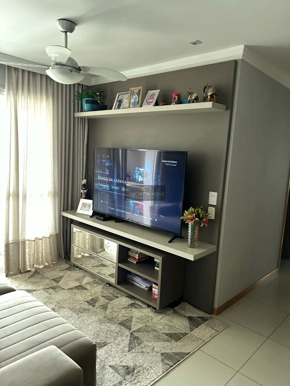 Móveis planejados em todos os ambientes, lustre, cortinas e ar-condicionado.